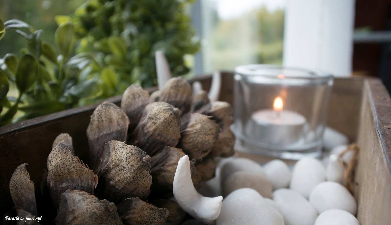 Varsinkin suuret kävyt ovat ihania erilaisissa asetelmissa, ihan yksittäisinäkin. Minulla on terassin pöydällä puulaatikko, jossa on valkoisia Weisten koristekiviä, Iittalan Kivi-kynttilälyhty, minikokoinen keramiikkaporonsarvi sekä yksi iso käpy. Ikeasta puolestaan löytyi hiljattain asetelman taustalle ihana puolukanvarpukranssi, joka korvasi kesällä pöydällä olleet yrtit.